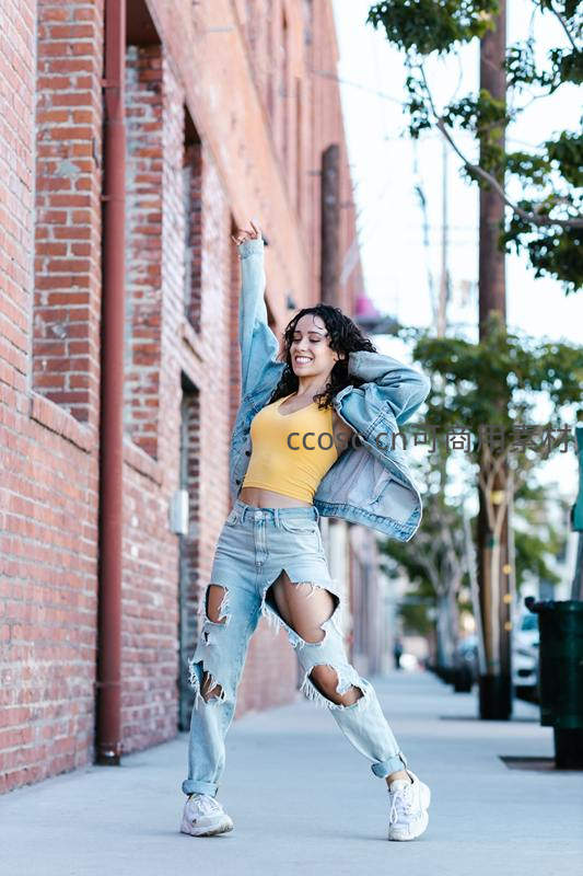 一位年轻女性在城市街道的红砖墙边即兴舞蹈,身穿黄色背心和破洞牛仔裤,动作充满活力与自信,展现都市青年的自由与快乐。