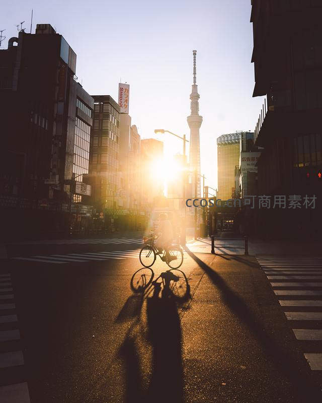 金色朝阳从东京塔后方洒下,一名骑行者在街道上投下长长的影子,温暖的光线与现代建筑交织,展现清晨城市的宁静与活力。