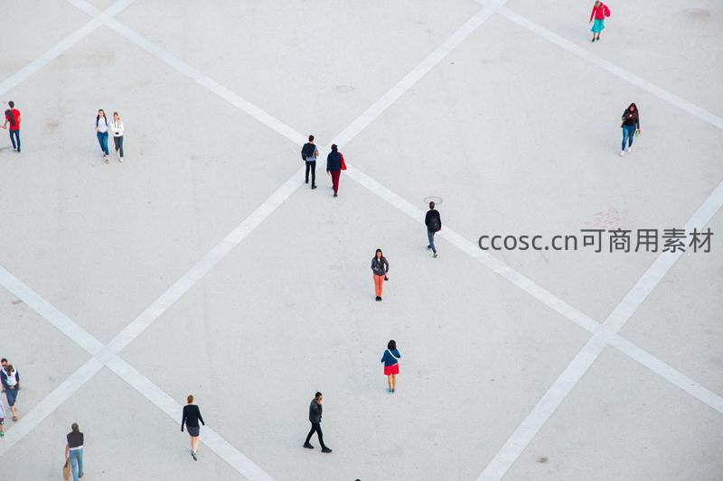 从高空俯瞰开阔的广场,白色线条划分出巨大的几何区域,零星行人如棋子般分布其中,呈现秩序与自由并存的视觉美感。