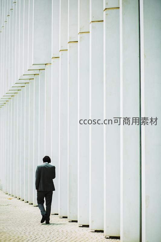 一排整齐洁白的立柱构成强烈的纵深感,一位西装男子背对镜头缓步前行,简洁的线条与人物的孤寂感形成强烈对比,充满艺术张力。