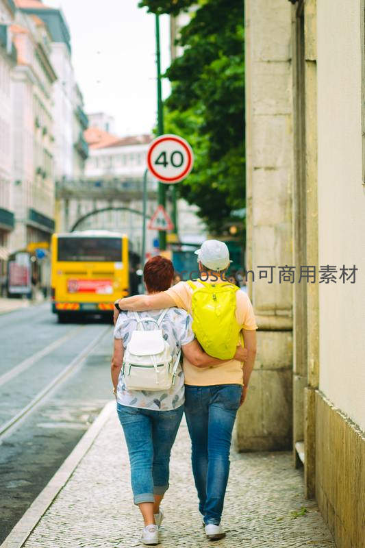 一对情侣亲密地挽着臂膀走在石板路上,身后是黄色电车和绿树成荫的老城区,画面洋溢着悠闲浪漫的度假气息与日常生活的温度。