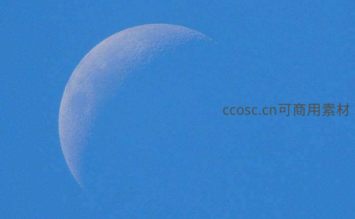 在纯净的蓝色天空中,一弯清晰的月牙静静悬挂,月球表面的环形山和纹理细节一览无余。