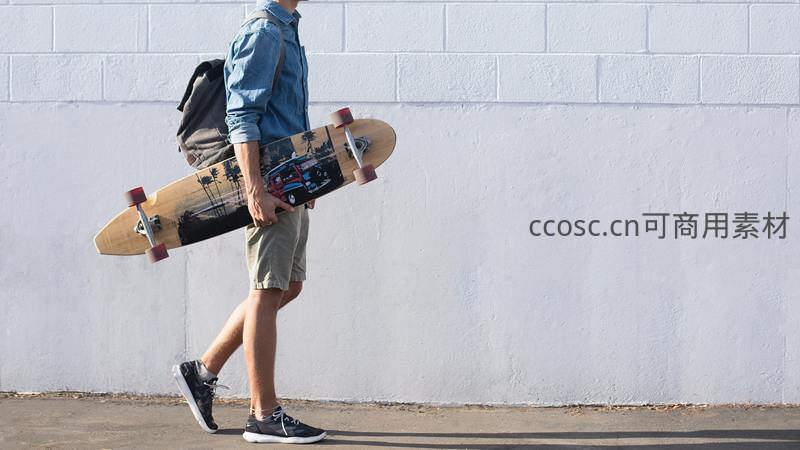 一位年轻男子背着背包,手拿印有棕榈树图案的滑板,穿着牛仔衬衫和短裤,正悠闲地走在一面洁白的砖墙前,充满青春活力与街头时尚感。
