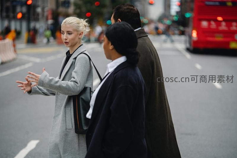 一位金发女子在城市街头与同伴交谈,手势生动表情投入,身着灰色大衣背着黑色包,背景是模糊的车流与红色巴士,捕捉了都市人交流的真实瞬间。