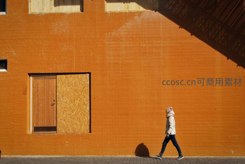 一位行人沿着一面巨大的橙色墙壁缓步前行,强烈的阳光投下清晰的影子,简约的构图与鲜明的色彩营造出独特的都市艺术感。
