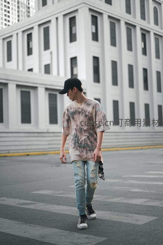 一名年轻男子身着扎染T恤和破洞牛仔裤,头戴黑色棒球帽,在现代风格的白色建筑前悠闲地走过斑马线,展现出都市青年的潮流与随性。