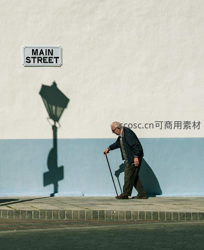 一位白发老者拄着拐杖缓缓走在“MAIN STREET”标牌下的街道上,身后路灯投下清晰的影子,墙面色彩分明,充满时光沉淀的宁静之美。