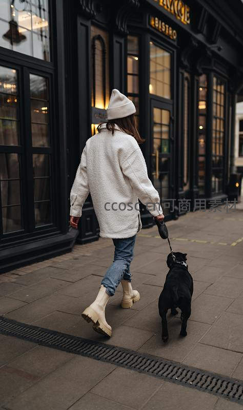 一位身着白色毛绒外套、头戴针织帽的女子牵着黑狗走在石板路上,背景是深色复古店铺门面,温暖而惬意的午后街头生活场景。