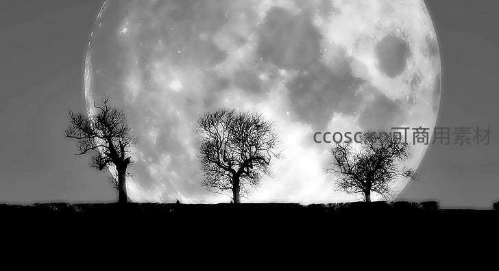 巨大的满月背景下,三棵枯树形成黑色剪影,营造出神秘而超现实的视觉效果,充满艺术感。