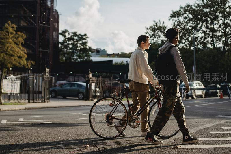 两位朋友在午后阳光下推着自行车穿过街道,影子拉长,背景是树木与建筑,营造出悠闲惬意的城市生活氛围。