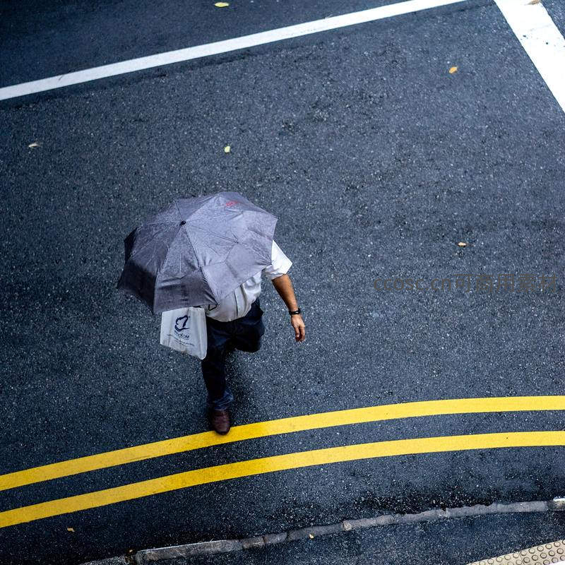 从高处俯瞰,一名男子撑着灰色雨伞,提着购物袋,独自走在被雨水浸湿的柏油路上,黄色双实线在脚下延伸,展现都市雨日的静谧与匆忙。