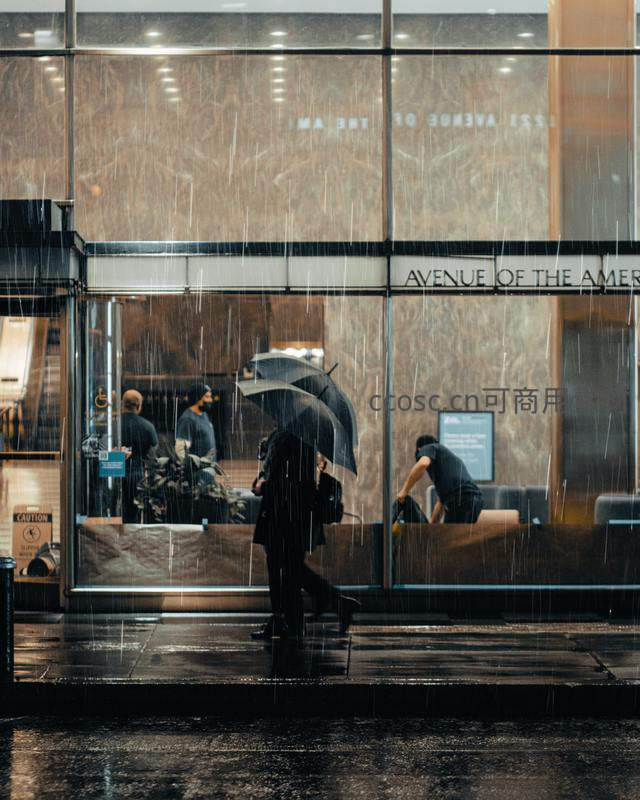 倾盆大雨中,行人撑伞穿行于现代玻璃幕墙前,雨水顺着玻璃滑落,模糊了内外界限,室内温暖灯光与室外湿冷形成鲜明对比,充满都市生活的质感。