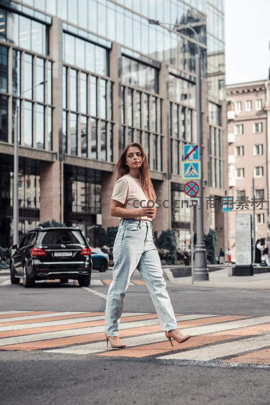 一位穿着简约时尚的女性正穿过城市十字路口,手握咖啡杯,背景是玻璃幕墙高楼和来往车辆,展现快节奏都市生活的优雅瞬间。
