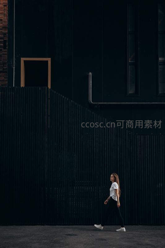 一名少女在深色金属墙面背景下缓步前行,强烈的明暗对比与几何线条构成视觉冲击,营造出冷静、孤独又充满设计感的艺术氛围。