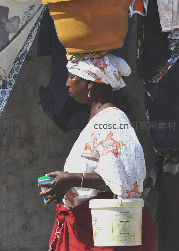 一位非洲妇女头戴花布头巾,稳稳顶着黄色容器,手提水桶,行走在市集小巷中,展现了当地女性坚韧的生活状态与独特文化风貌。