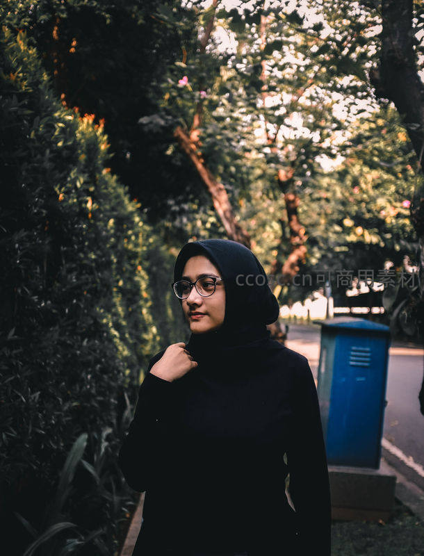 戴眼镜女子公园漫步,黑色头巾衬托知性美