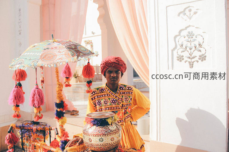 一位身着鲜艳黄色民族服装、头戴红色头巾的印度街头艺人,站在装饰华丽的彩伞和彩球旁,身旁摆放着精美的彩绘陶罐,展现浓郁的传统艺术氛围。