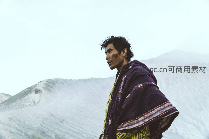 一位身披深紫色民族斗篷的男子伫立在白雪皑皑的山峦前,侧脸凝视远方,背景是苍茫的雪域高原,展现出人与自然和谐共存的静谧之美。