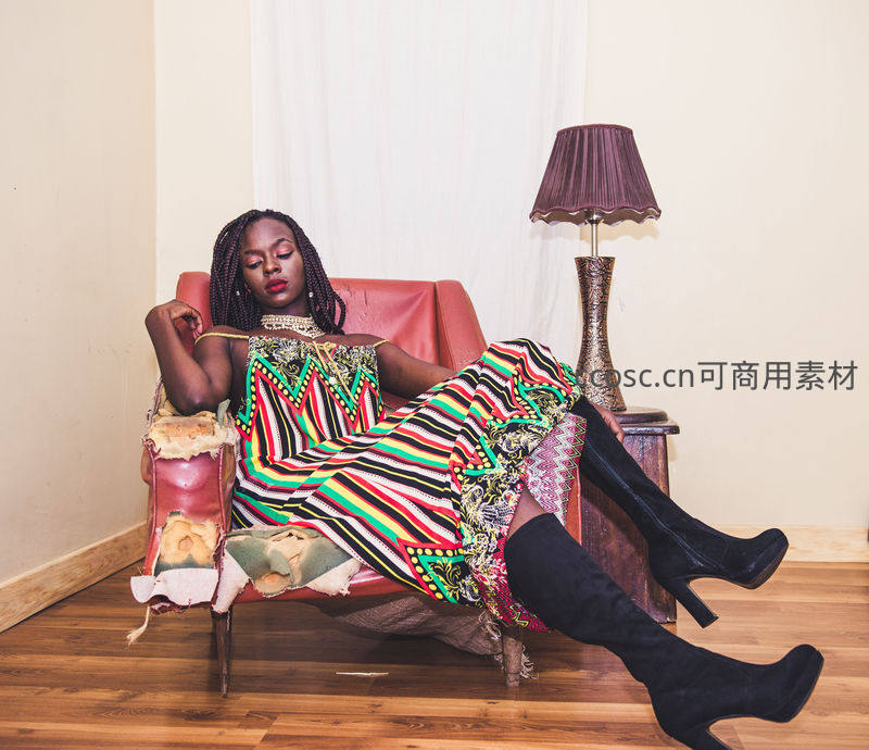 一位非洲女性身着鲜艳条纹民族风连衣裙,搭配黑色高跟长靴,慵懒地斜倚在复古红色皮沙发上,背景简约温馨,尽显异域风情与现代时尚融合之美。