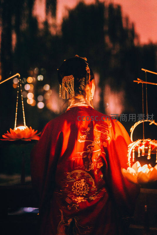 夜幕下,一位身着华丽红色刺绣长袍的女子背对镜头,发髻高挽配精致步摇,身旁漂浮着点亮的莲花灯,暖光映照出她沉静的身影,营造出梦幻古典氛围。