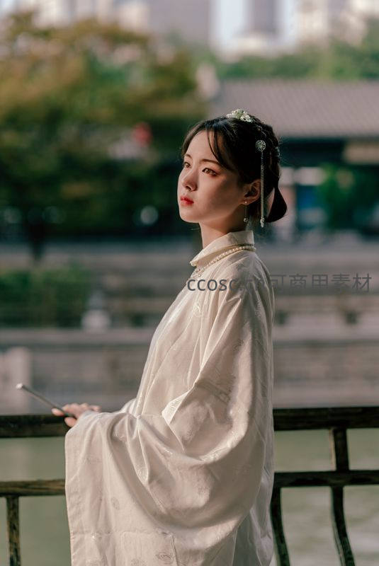身着素雅汉服的少女立于桥畔,发髻高挽配精致发簪,手持团扇侧首回望,背景绿意朦胧,尽显东方古典韵味与宁静之美。
