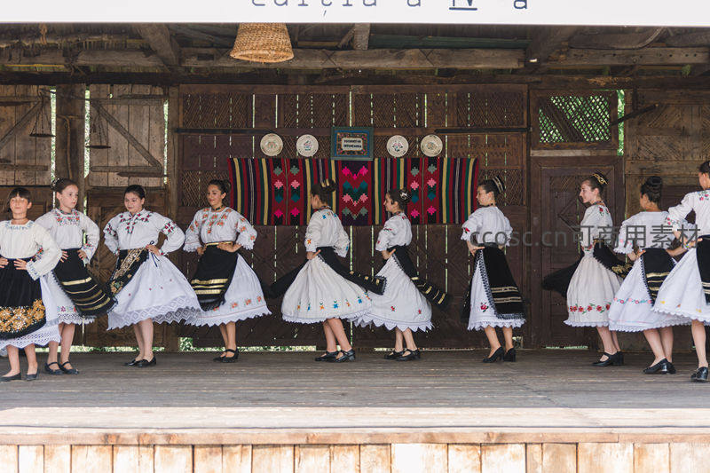 一群身着精美刺绣民族服饰的女舞者,在古朴木结构舞台上同步起舞,背景挂毯与陶盘彰显浓郁民俗风情。