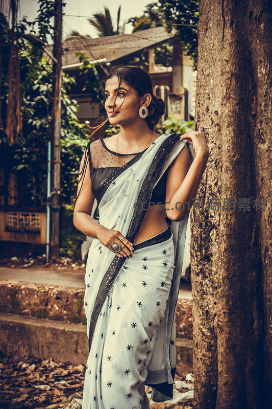 穿纱丽的女子倚树凝望远方