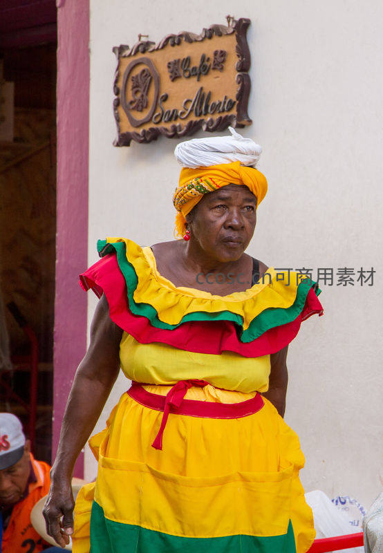 一位身着鲜艳黄红绿三色传统服饰、头戴白巾的老妇人,在“Cafe San Marco”招牌下缓步前行,充满异域风情。