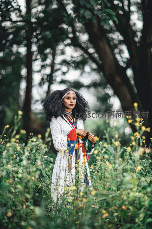 一位卷发少女身着白色长裙,佩戴彩色民族风项链与手环,伫立在开满黄花的林间草地上,神情宁静而神秘。