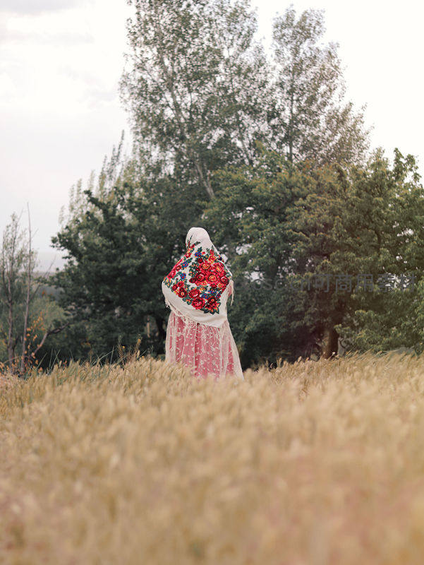 一位身着粉色长裙、披着绣满红花的白色头巾的女子,静立于广袤的金色麦田中,背景是郁郁葱葱的树林,画面充满田园诗意与宁静之美。