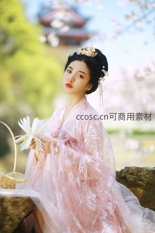 身着粉色薄纱汉服的少女,在春日樱花树下静坐,头戴精致花冠,手持白莲,背景古塔朦胧,尽显东方古典韵味与宁静之美。