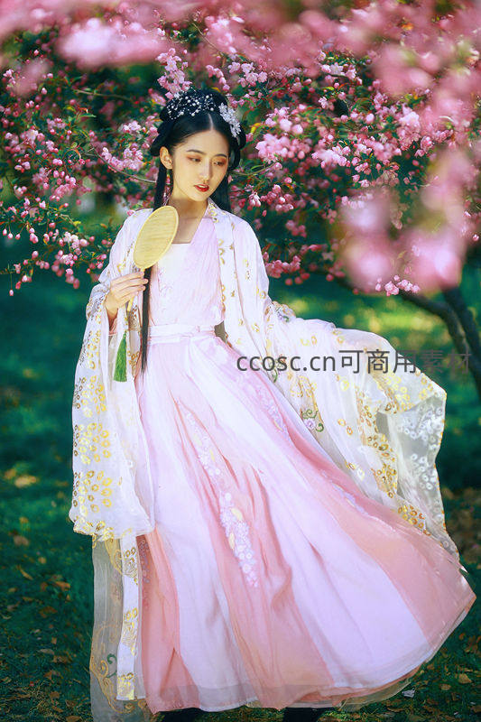 一位穿着粉白相间、绣有金纹的汉服女子,置身于繁花似锦的桃林之中,手持团扇优雅回眸,裙摆飞扬,宛如画中仙子。