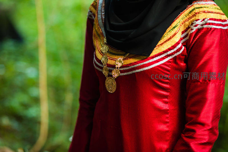 聚焦于一位身着红色传统服饰的女子,其胸前悬挂着一串精美的金色圆形吊坠项链,搭配黑色头巾与彩色镶边,尽显民族风情与工艺之美。