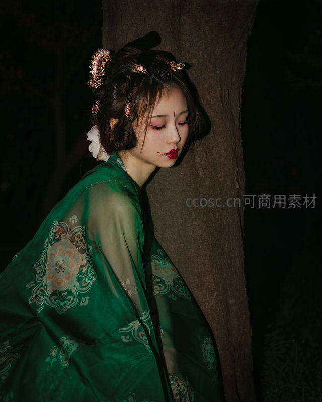 夜色中绿衣古装女子倚树,妆容精致如画