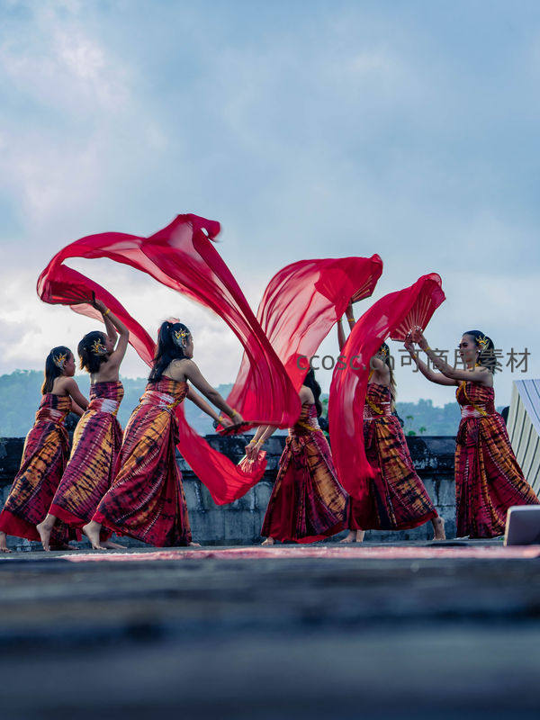 数位身着印尼传统服饰的女舞者在屋顶平台上翩翩起舞,手中挥舞着鲜红的丝质长绸,动作优美流畅,背景是朦胧的远山与天空,充满动感与艺术气息。