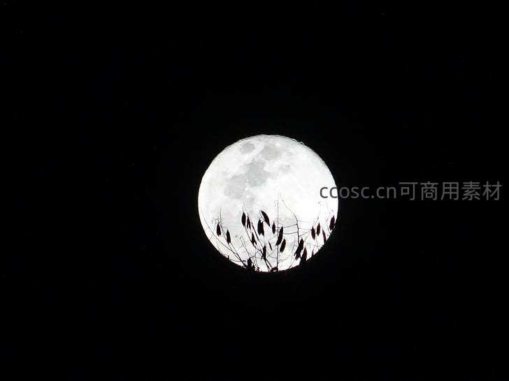 一轮圆满的明月高悬于漆黑天幕,前景枯枝如墨线勾勒,极简构图中蕴藏着东方水墨般的宁静与禅意。