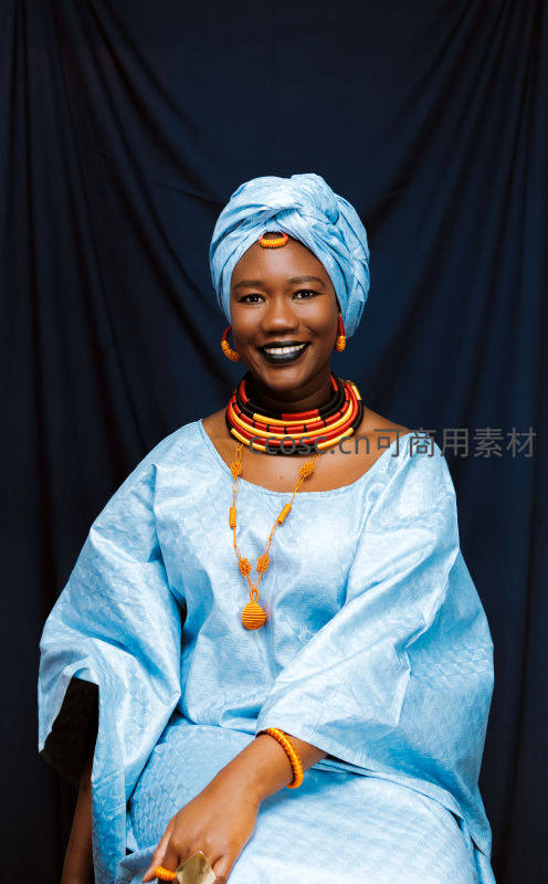 一位面带灿烂笑容的非洲女性,身着浅蓝色传统服饰,佩戴色彩鲜艳的串珠项链与手镯,充满文化魅力。