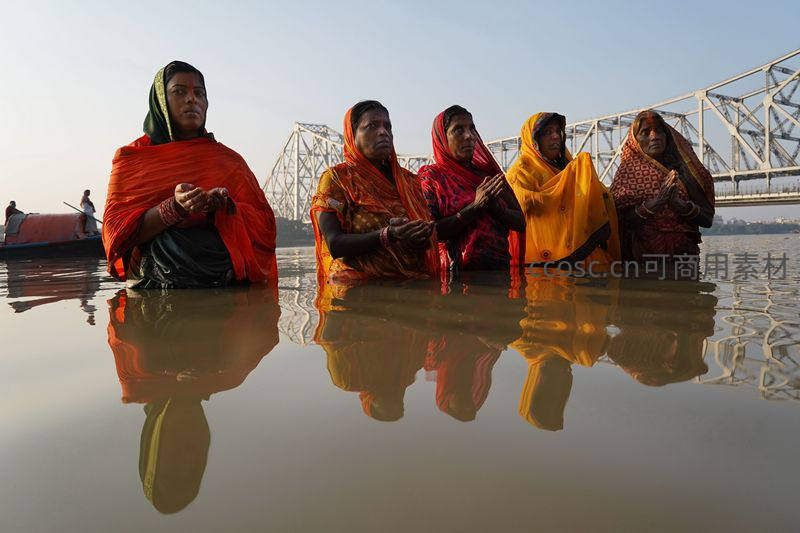 五位身披鲜艳纱丽的妇女伫立于恒河水中虔诚祈祷,身后豪拉大桥清晰可见,水面倒影与天光相融,构成一幅宁静而神圣的信仰画卷。