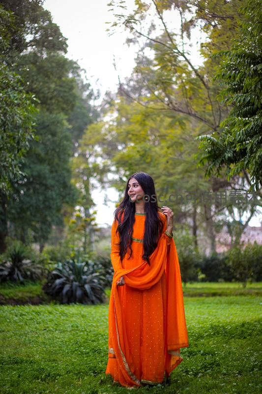 一位长发女子身着明亮橙色纱丽,在郁郁葱葱的林间草坪上轻盈漫步,阳光透过树叶洒落,营造出温暖、宁静且充满生机的自然氛围。