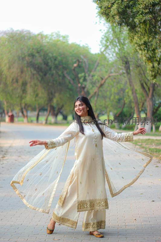 一位身着米白色印度传统服饰的女子在绿树成荫的公园小径上旋转,裙摆飞扬,面带灿烂笑容,尽显优雅与活力。