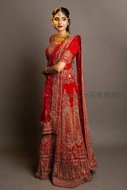 一位印度新娘身着繁复精美的红色礼服,搭配大量金色珠宝和头饰,在纯色背景前展现庄重典雅的婚庆氛围。