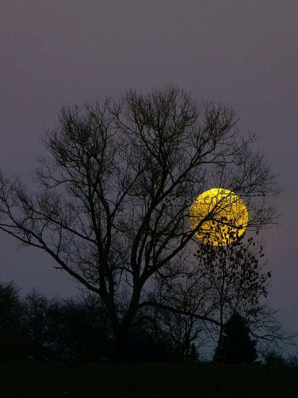 一轮金黄满月从光秃的树枝间升起,深色剪影与明亮月光形成强烈对比,营造出宁静而神秘的夜晚氛围。