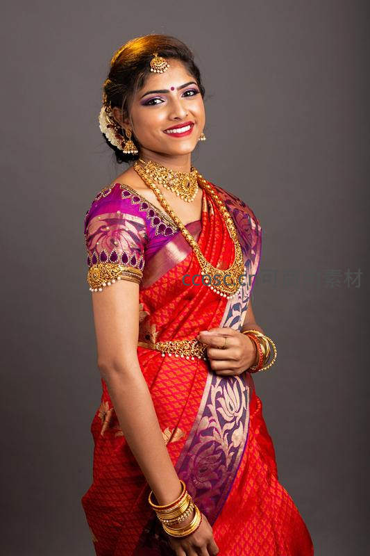红紫相间纱丽配黄金首饰的印度美女