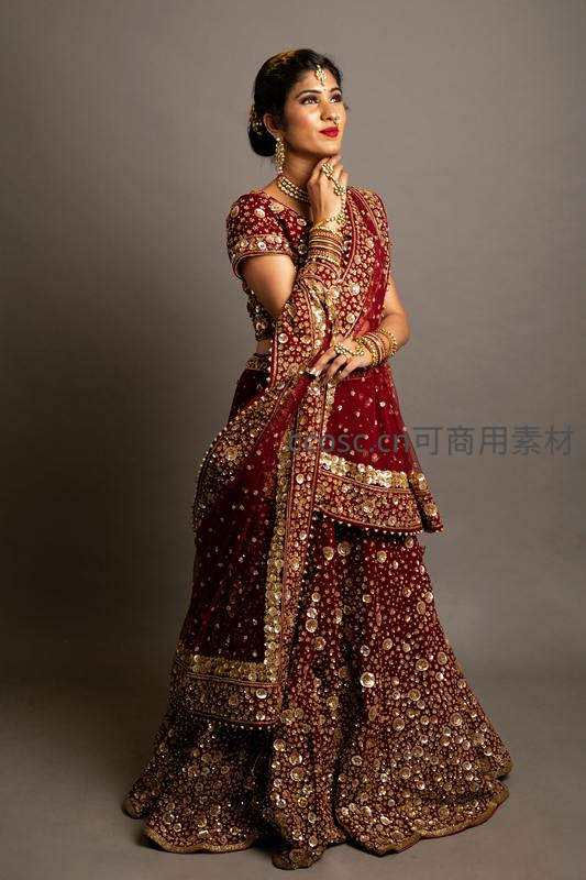 新娘身穿深红色镶金刺绣的印度传统礼服,姿态优雅地轻抚颈间项链,头饰与手镯熠熠生辉,尽显高贵典雅的东方新娘之美。
