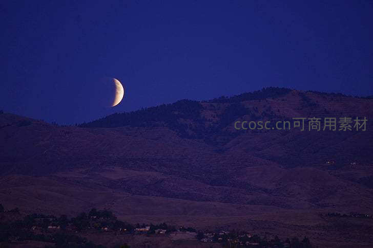 一弯纤细的新月高悬于深蓝色的夜空,温柔地俯瞰着连绵起伏的山峦和山脚下的点点灯火,画面静谧而富有诗意。