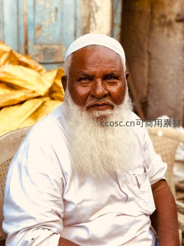 一位留着浓密白胡须的老者身穿白衣,头戴白色帽子,坐在藤椅上凝视前方,面容饱经风霜,充满岁月沉淀的智慧。