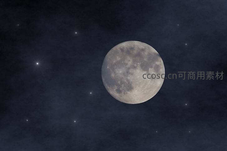 一轮清晰的满月在深邃的夜空中闪耀,周围点缀着闪烁的星辰和淡淡的云雾,展现了宇宙的浩瀚与神秘之美。