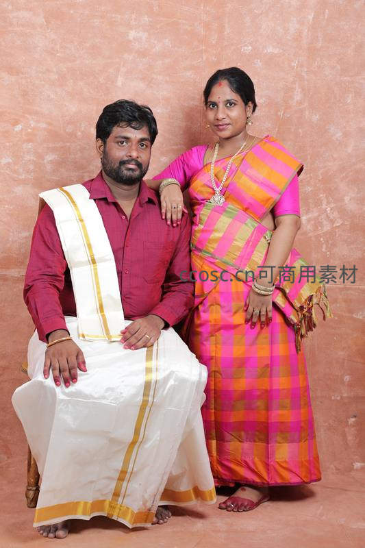 一对夫妇身着色彩鲜明的传统印度服饰,在柔和的暖色背景前亲密合影。男士穿白色纱笼,女士着粉橙格纹纱丽,尽显文化韵味与家庭温情。