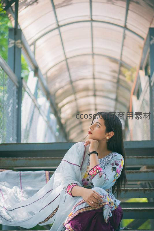 一位身穿绣花长袍的少女坐在弧形玻璃顶棚的天桥下,手托下巴凝望远方,柔和光线勾勒出她宁静的侧影,融合现代建筑与古典服饰的诗意瞬间。