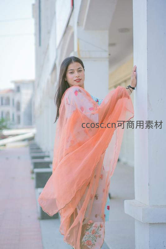 一位年轻女子身穿淡色衣裙,披着橙色薄纱,在白色建筑的街角回眸浅笑,纱巾随风飘动,营造出浪漫清新的氛围。